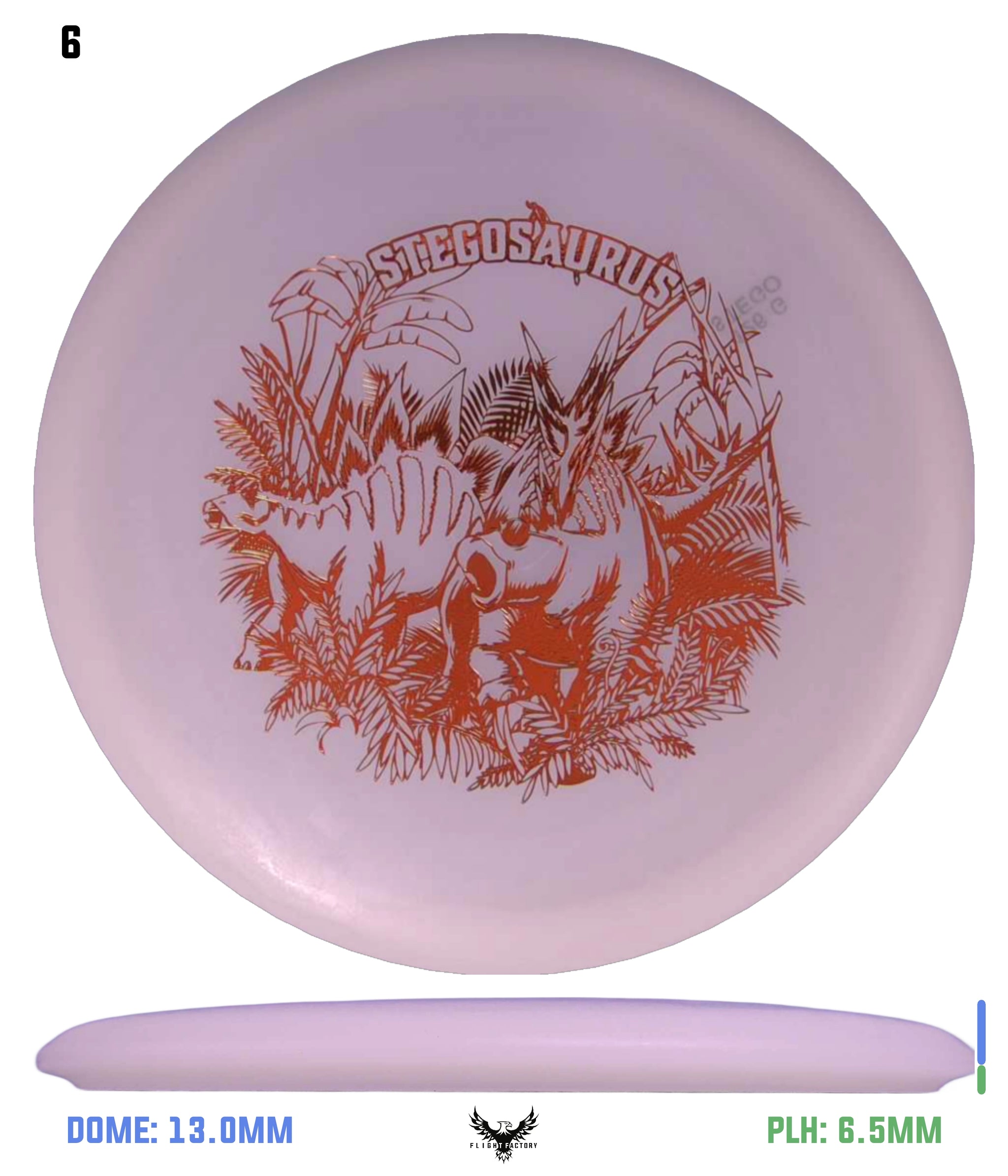 The Stegosaurus is the quintessential mid-range driver designed for some turn with a little bit of end-fade. Of course, in a lighter weight, it is more understable than the flight numbers might suggest. But for kids, this mid will do the trick in fading to the basket for a short putt. It has a somewhat deeper rim for more of a "frisbee" feel for new players.