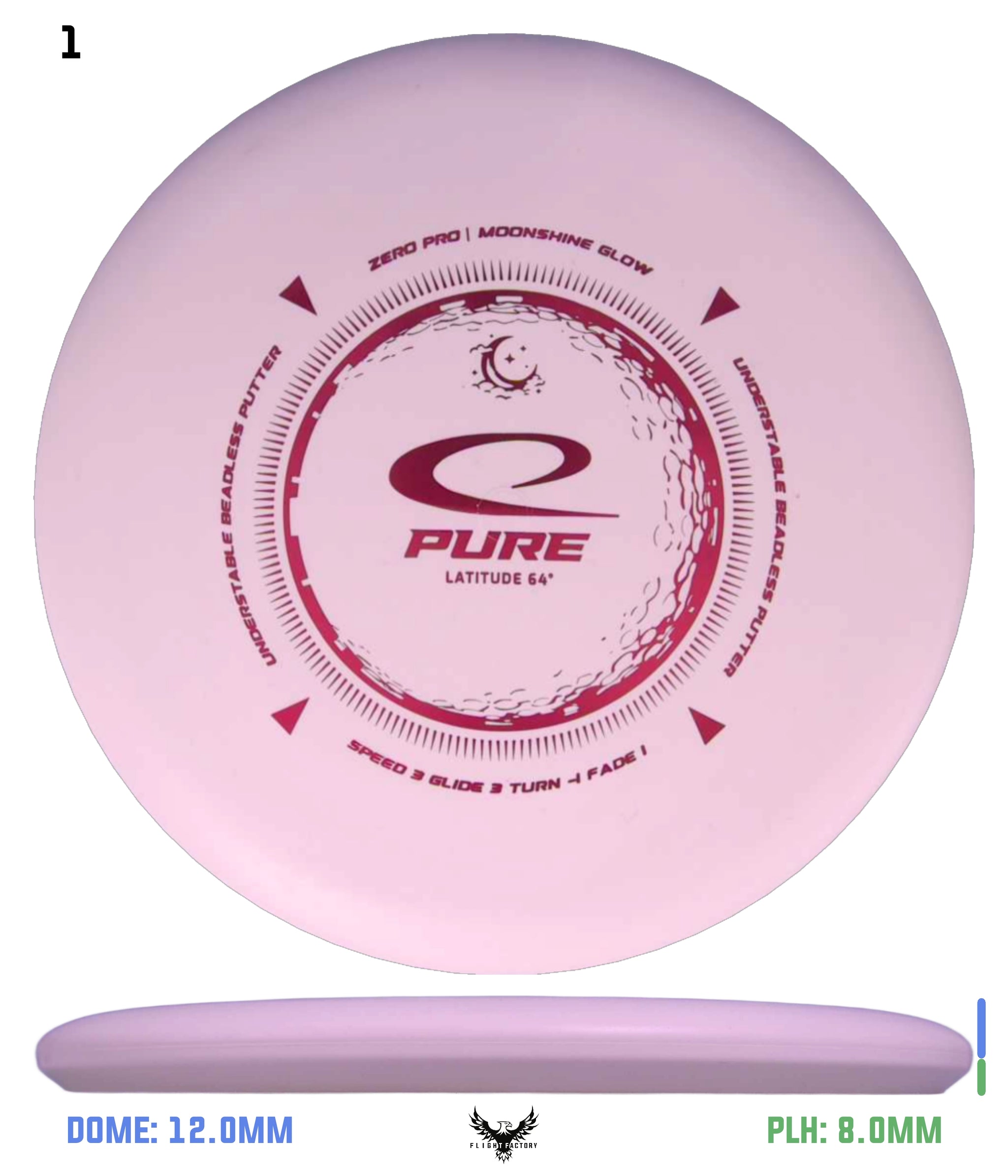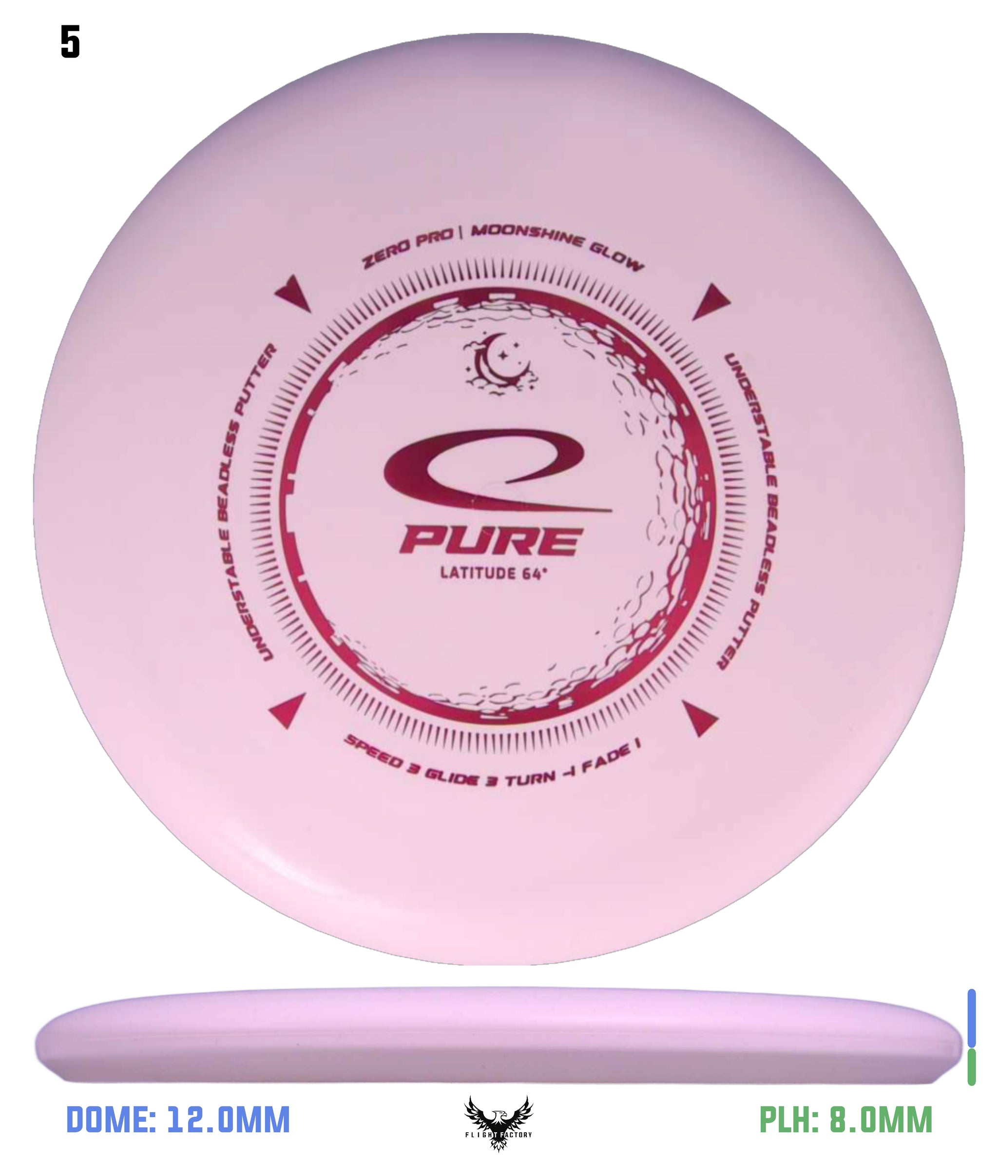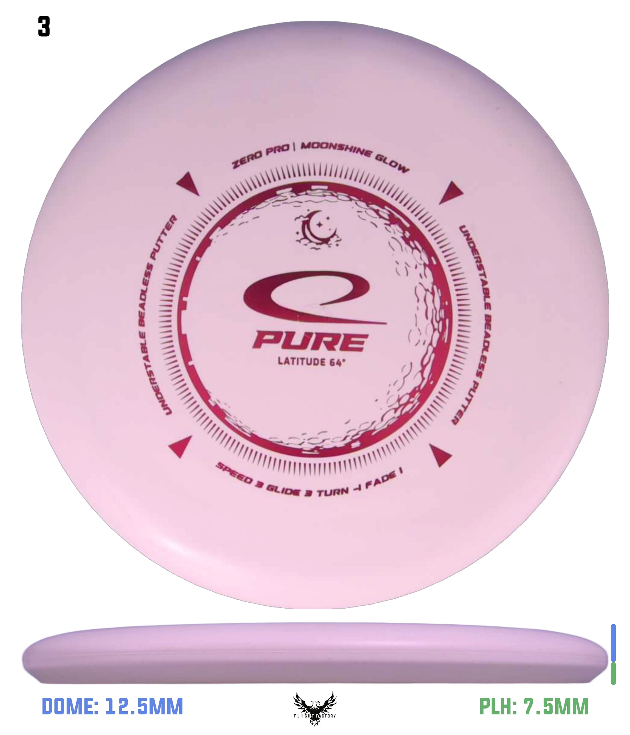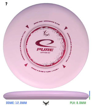 Zero Pro Moonshineis the firm, yet surprisingly grippy, putter plastic with amazing durability. The Zero Pro blend resists wear while maintaining a reliable grip, round after round. Adds a glow-in-the-dark-effect to the disc. When playing disc golf during nighttime, all you need is to grab your flashlight, or any other strong light source, and charge up the glow properties of the plastic. From 2023 the improved Moonshine 2.0 formula is being used.